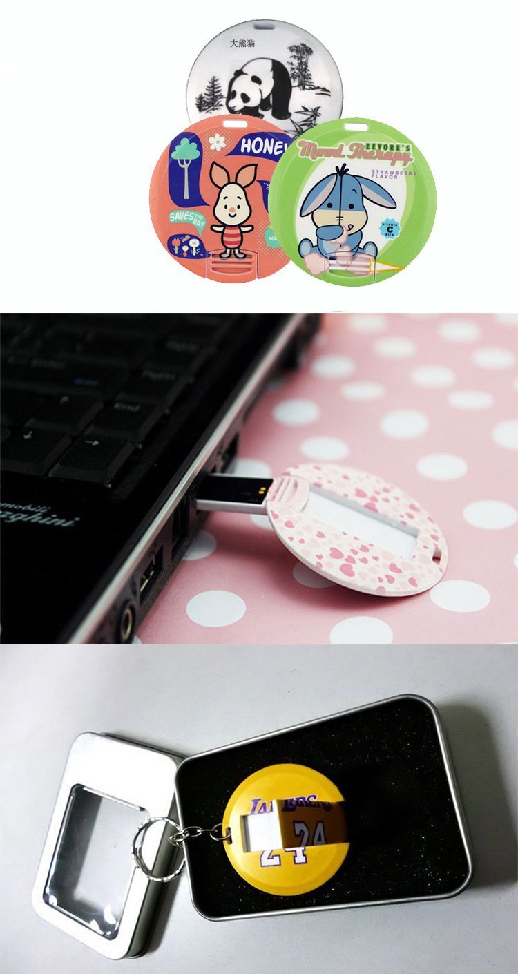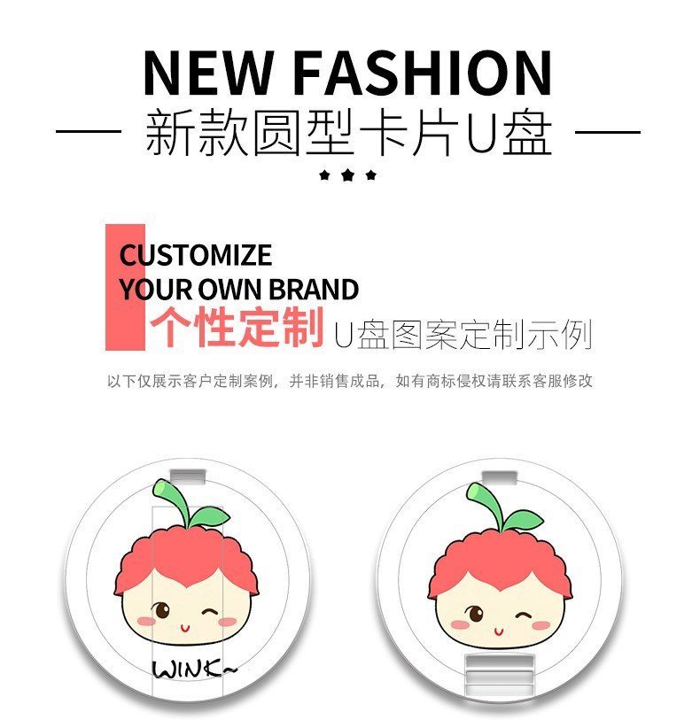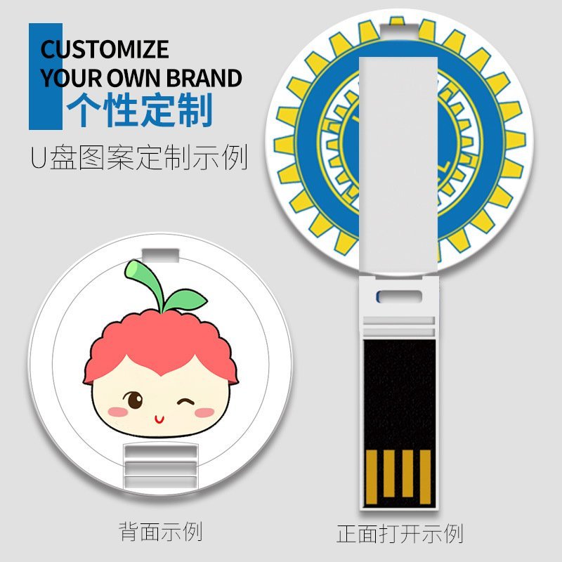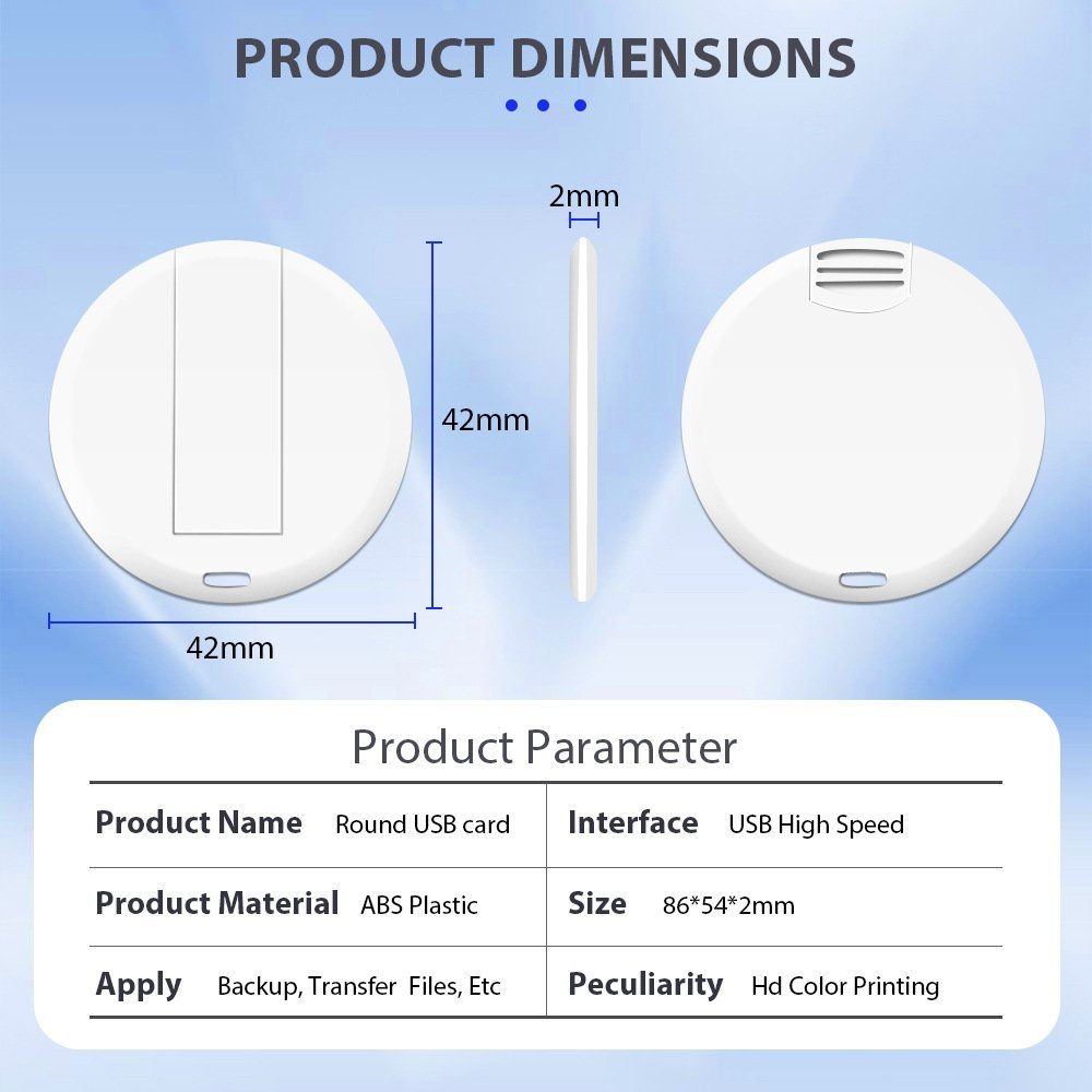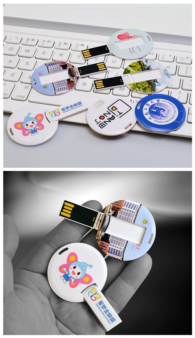 The Round Card USB drive is a storage device the size of a credit card that can be printed with colorful content on both sides, making it suitable for gifts or business promotional materials. It can store various types of documents and is very portable, while also being able to display your brand or personalized design to increase brand exposure and awareness. It can also be used as a business name card to attract more people to remember you and your company.